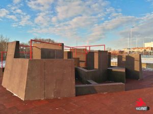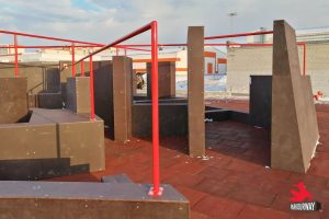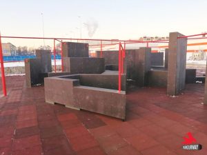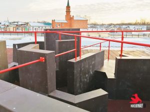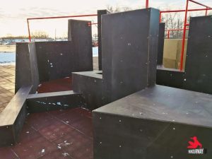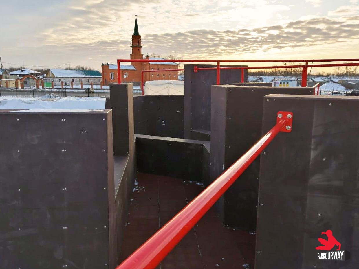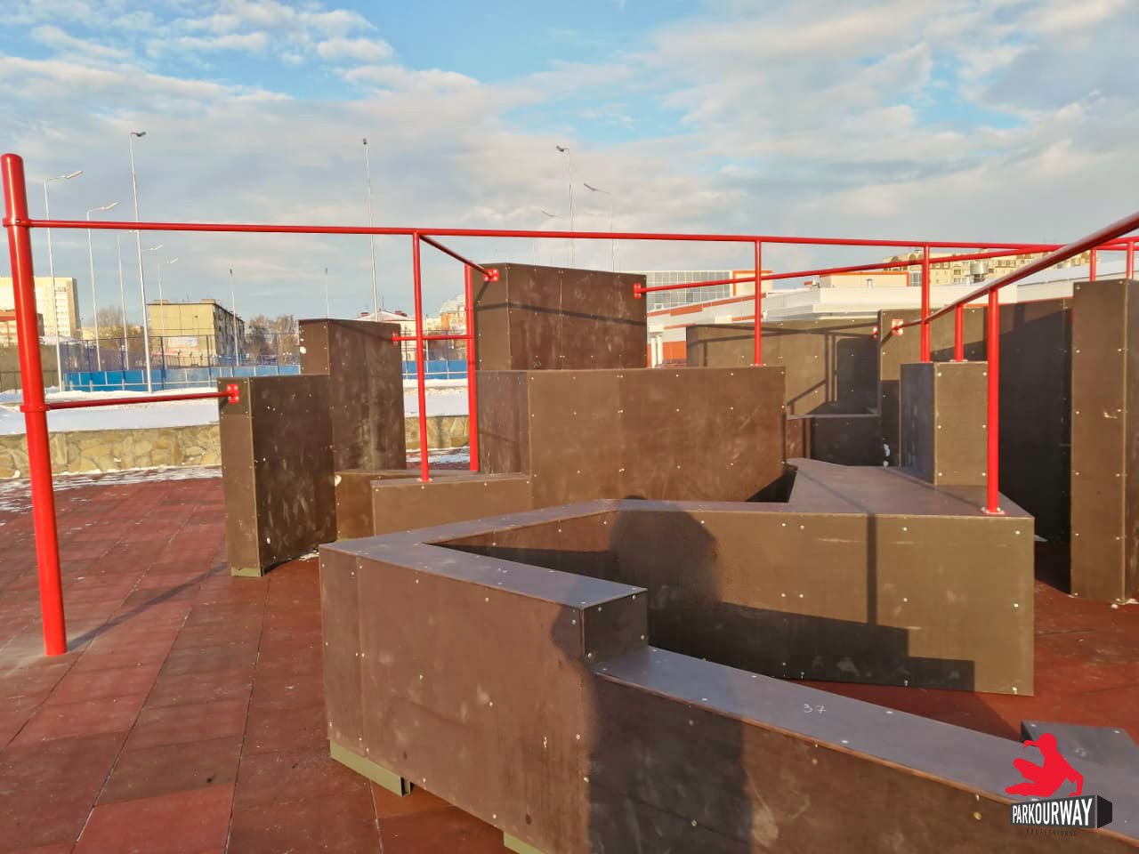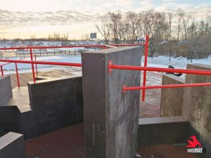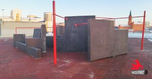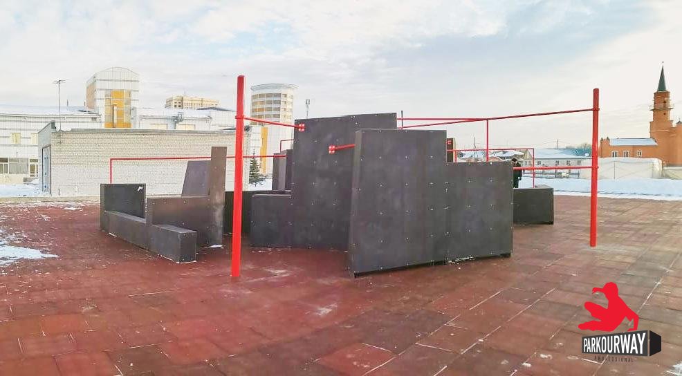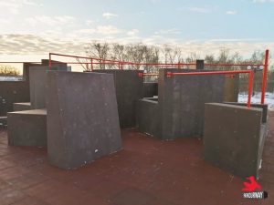 Все оборудование для паркура установлено на бетонное, монолитное основание, поверх которого уложено травмобезопасное покрытие в виде резиновой плитки толщиной 10 мм. Фигуры собраны на металлическом каркасе, обшитом финской ламинированной фанерой с нанесением сетчатого рифления. Все элементы паркур площадки изготовлены на нашем собственном производстве с применением высокоточного оборудования, металлические секции прошли этапы пескоструйной обработки, грунтовки и обработаны полимерно-порошковым покрытием. Крепеж, применяемый при сборке оборудования для паркур площадки, оцинкован и устойчив к воздействию окружающей среды.
